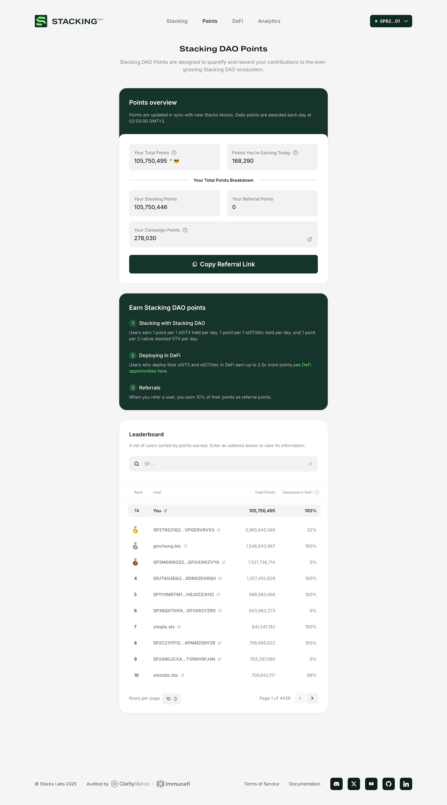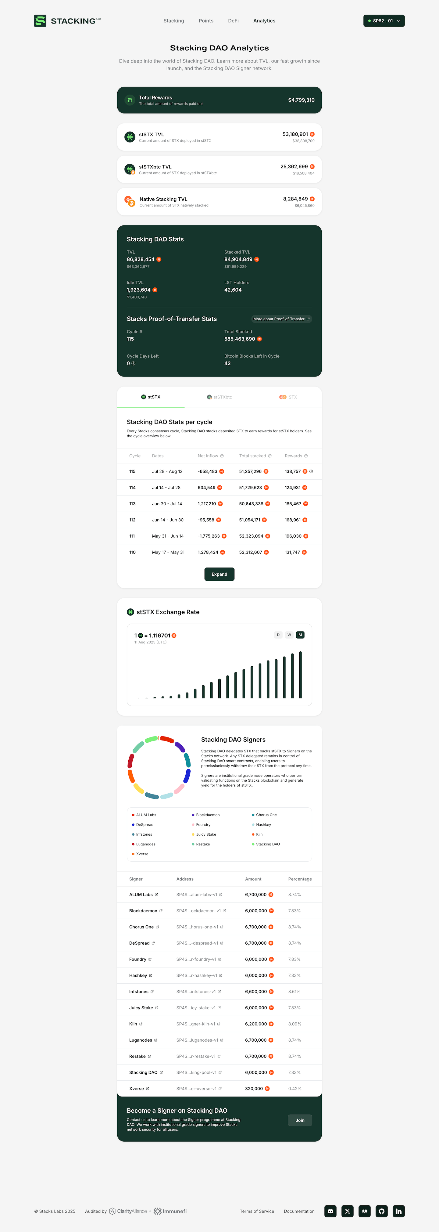 Stacking DAO is a Bitcoin-native staking platform that simplifies STX delegation and reward tracking for users in the Stacks blockchain ecosystem. The application allows users to stake STX in a custodial or non-custodial manner and access transparent reward insights.