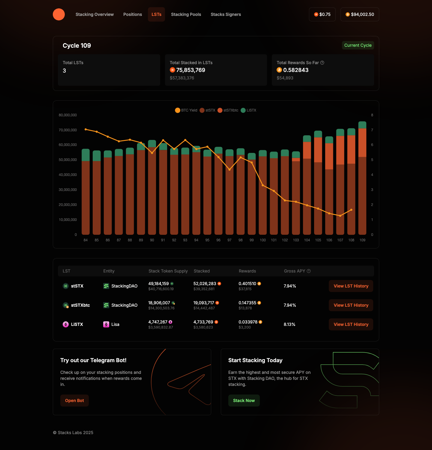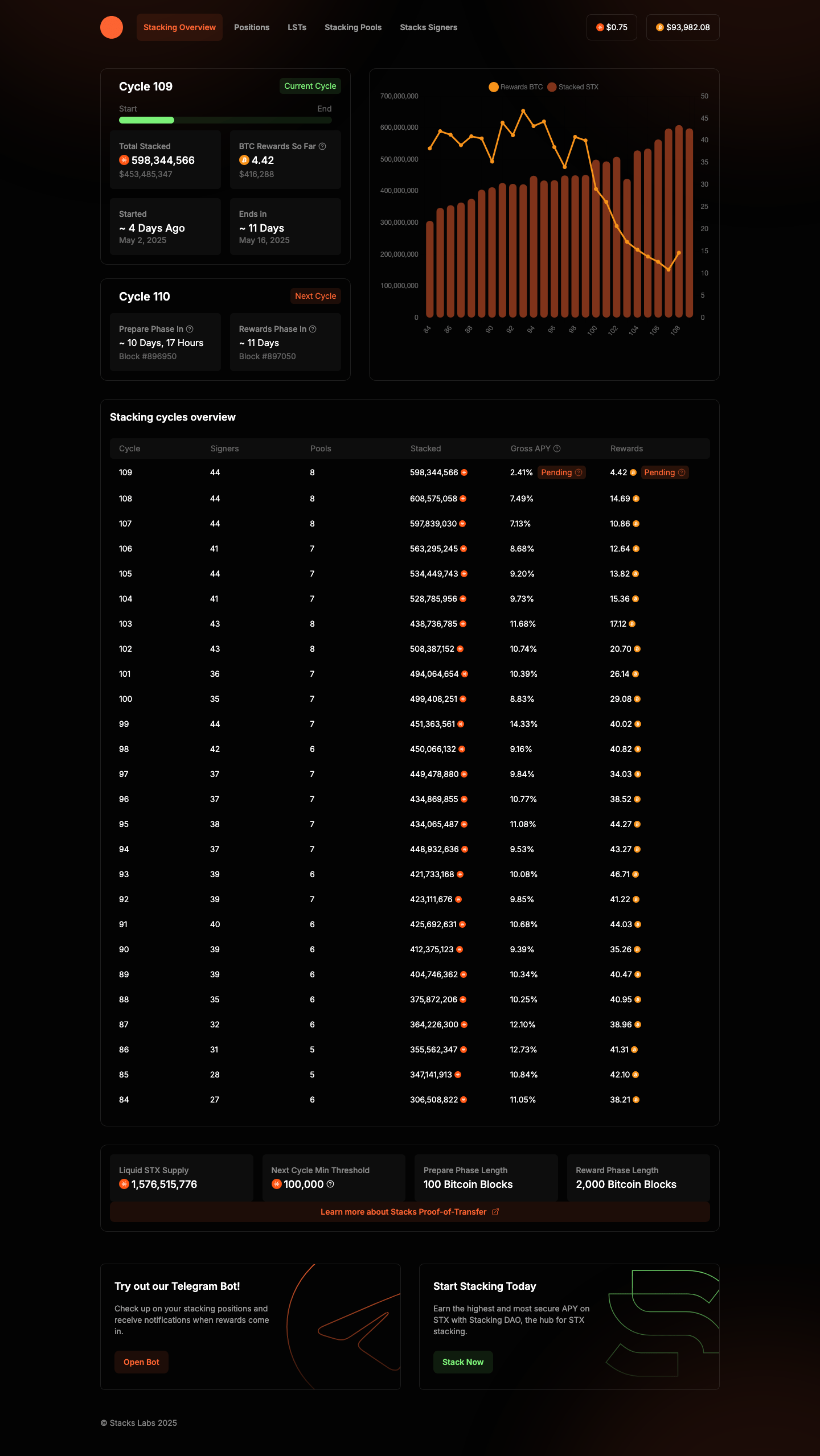 The Stacking Tracker is a web-based dashboard that provides real-time insights into Stacks (STX) staking activity. It offers a transparent view of stacking cycles, yield estimates, and protocol-wide performance metrics—making staking more accessible and data-driven for both new and experienced users.