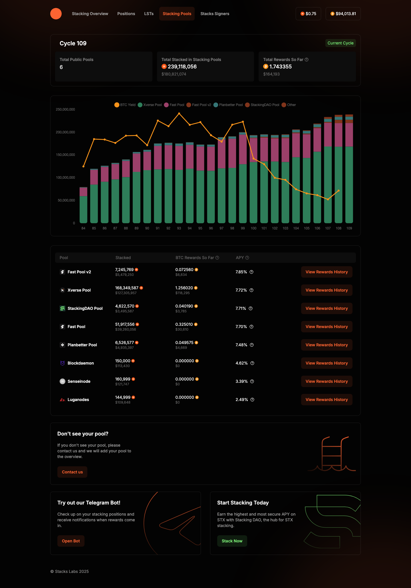 2024Real-time dashboard for Stacks blockchain staking analytics. Built responsive React/Next.js interface translating complex on-chain data into accessible insights.