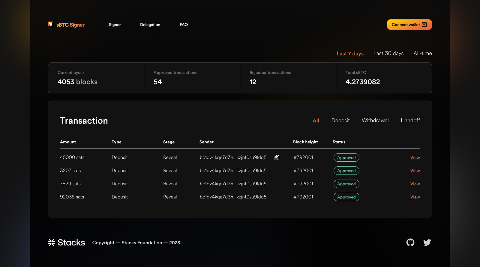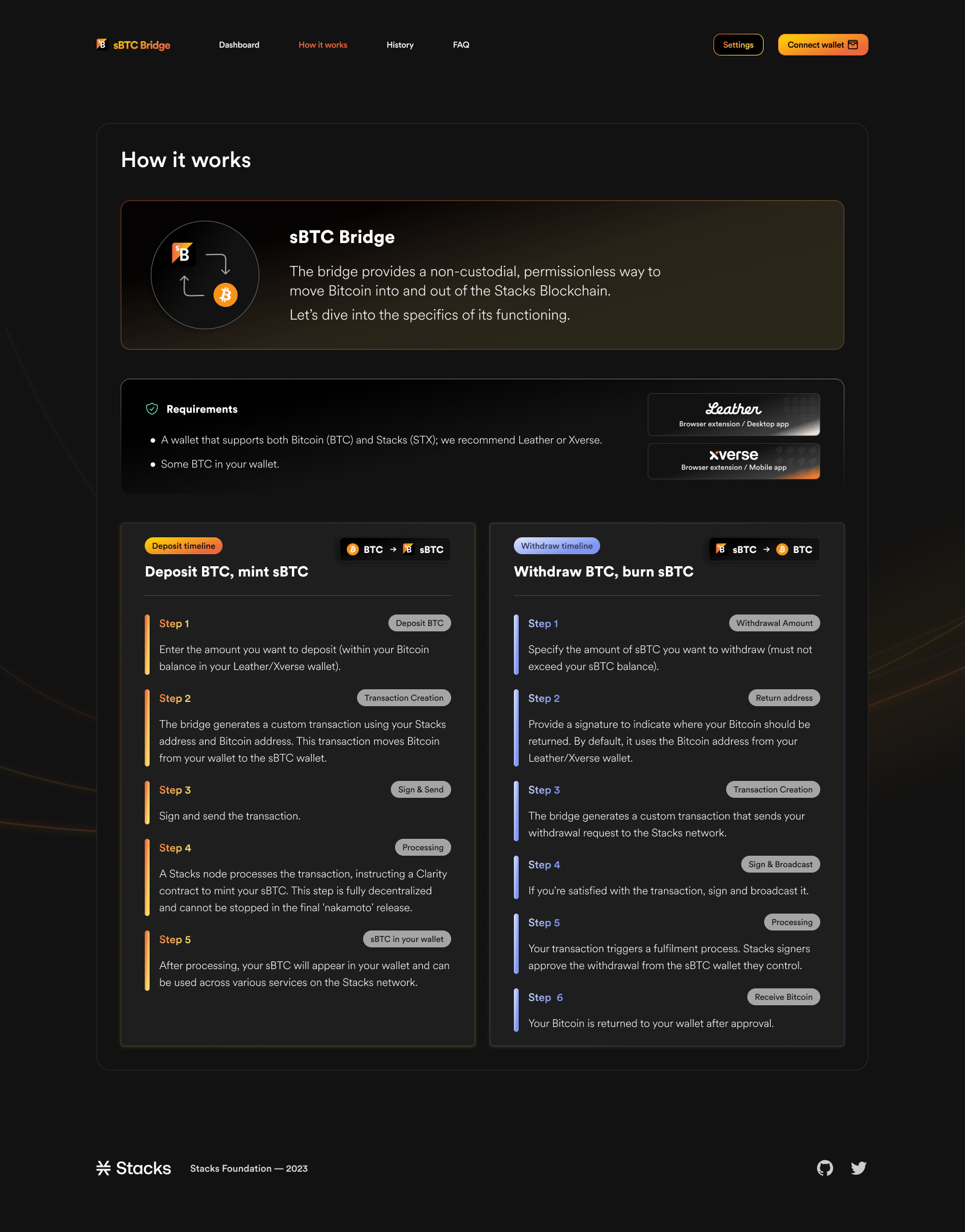 2024Led UX/UI design for sBTC infrastructure tools commissioned by Stacks Foundation. Created design system and user flows for bridge, signer dashboard, and staking tools.