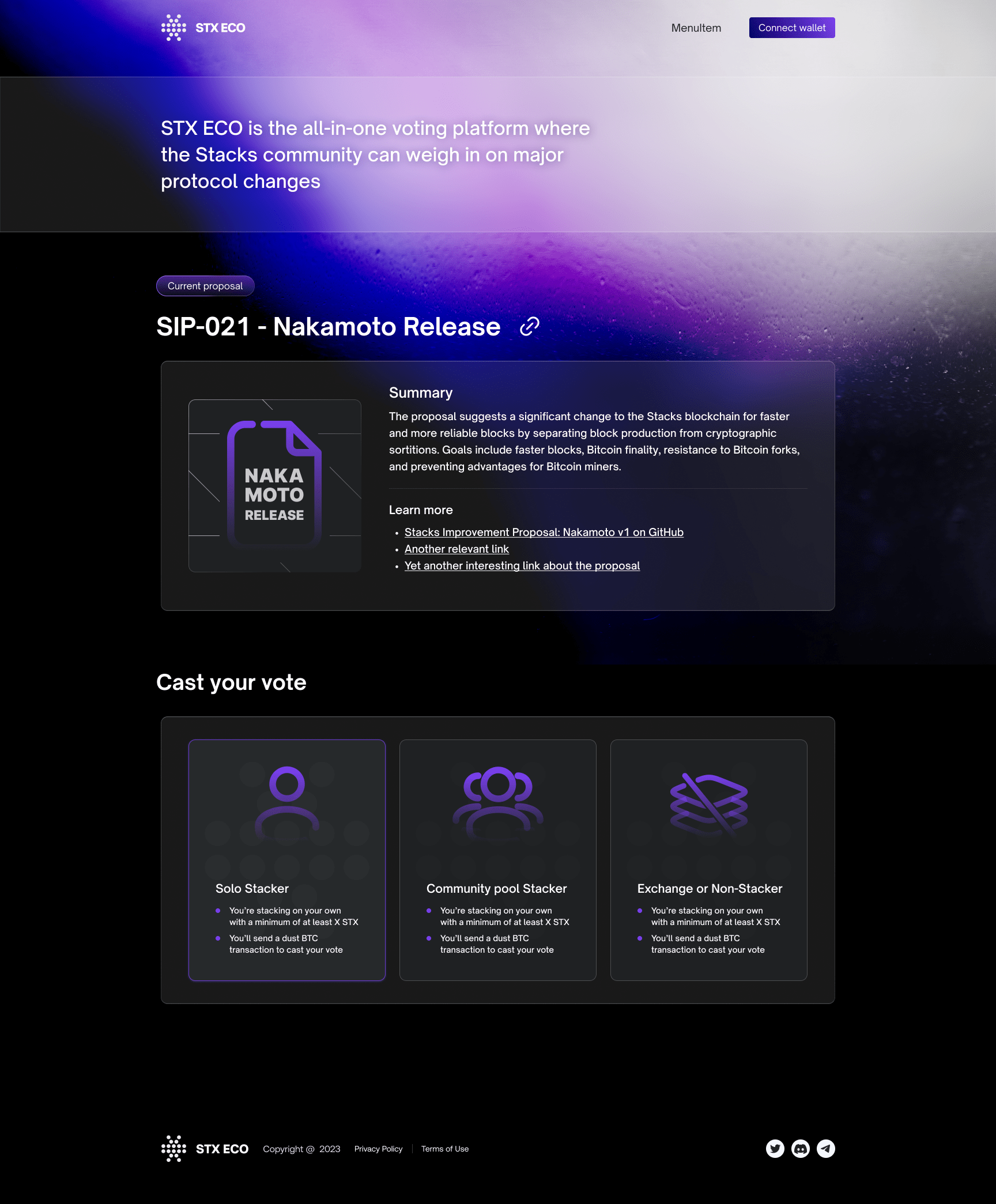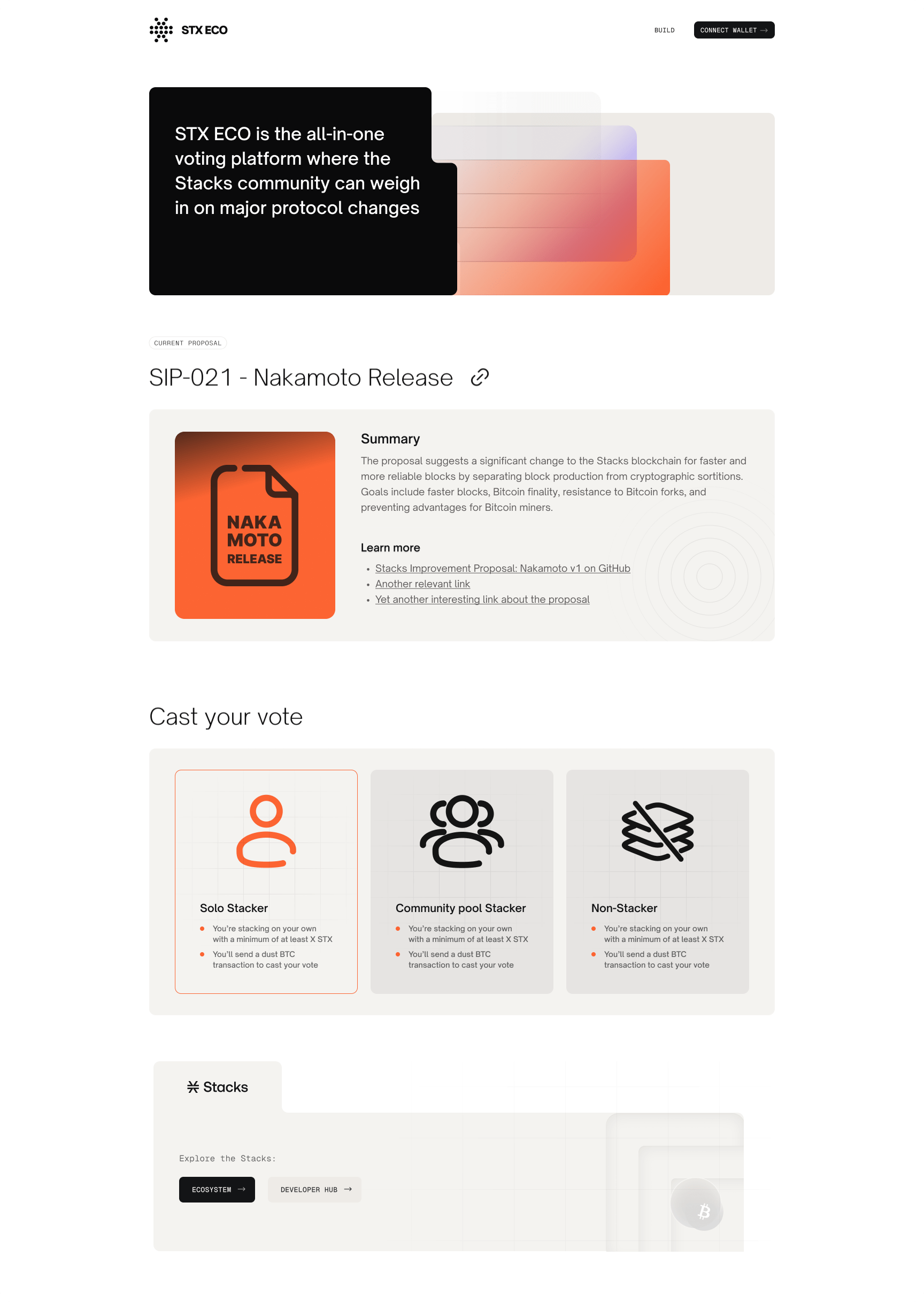 2024Designed and built voting portal for Stacks Nakamoto upgrade. Created accessible interface guiding community through governance process and voting timelines.