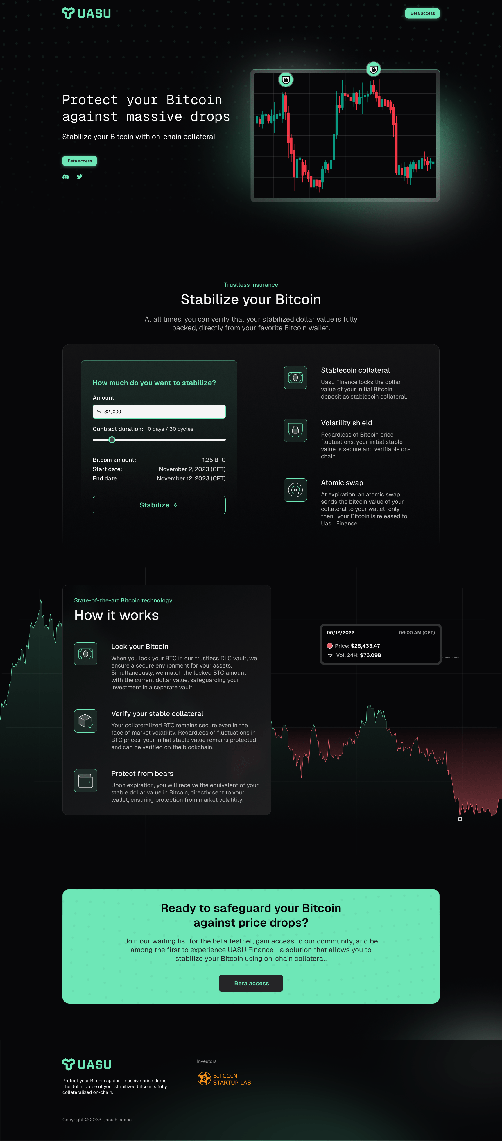 The redesigned version introduces a bold, high-contrast visual system inspired by trading dashboards and dark-mode interfaces familiar to crypto users. I replaced illustrations with data-driven visuals and real chart patterns to signal seriousness, precision, and trustworthiness. Interactive modules — like the stabilization form — now feel more tactile and grounded, with subtle neon accents and grid patterns adding to the futuristic tone.